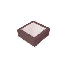 Cajas Pastelería Con Ventana Chocolate 30 x 30 x 8 cm. Cajas de pastelería fabricadas en cartón nano - micro ondulado con 250 g/m². Con ventana OPP fácil de quitar con alta visibilidad. Apertura frontal que permite introducir y retirar los postres con facilidad. Muy resistentes y ligeras. Biodegradables y reciclable. Aguanta temperaturas de -18ºC hasta +70ºC. Dimensiones: 30 x 30 x 8 cm.